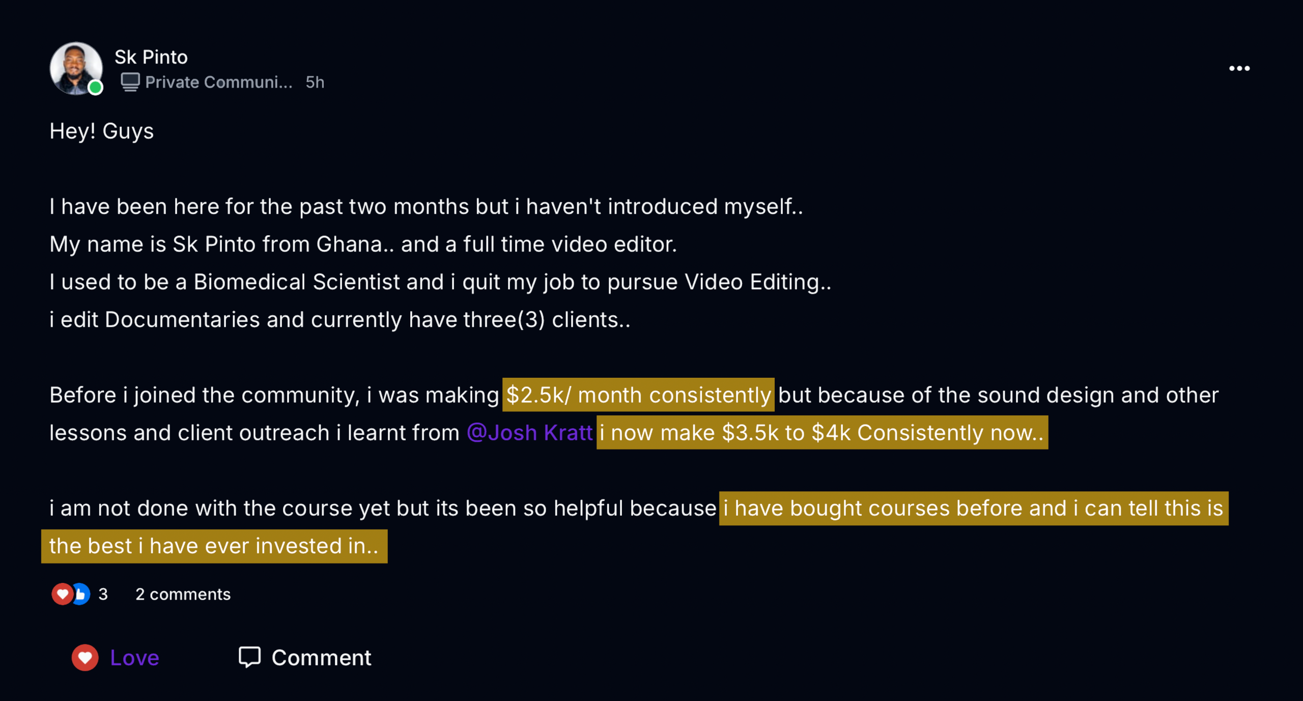 A great video editor doesn’t just follow a script, they bring the story to life. Josh did that perfectly in every edit while also paying attention to the smaller details like sound design, using outtakes creatively, and understanding the audience to keep the video engaging throughout. I’m definitely making sure my next editor takes Josh’s course, because time is money, and it’s going to save me both.